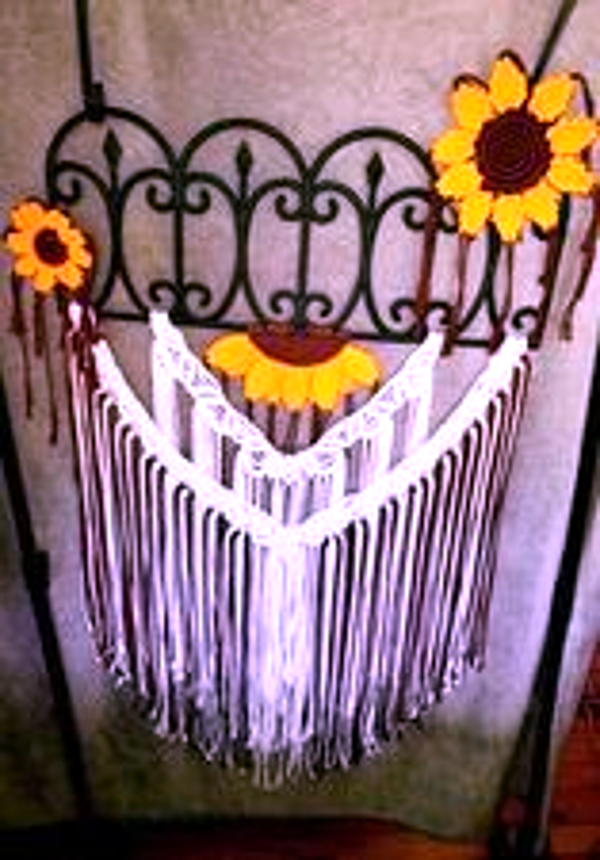 Large 23inH x 36inL macrame sunflower decor. Handmade with 100% Cotton and plastic(iron look)